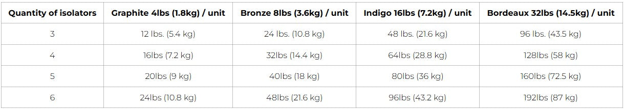 Each OREA Graphite isolator has a weight capacity of 4 lbs (1.8 kg). Sold individually for flexibility. Minimum of three units recommended per application. Total capacity: 12 lbs (3 units) or 16 lbs (4 units).