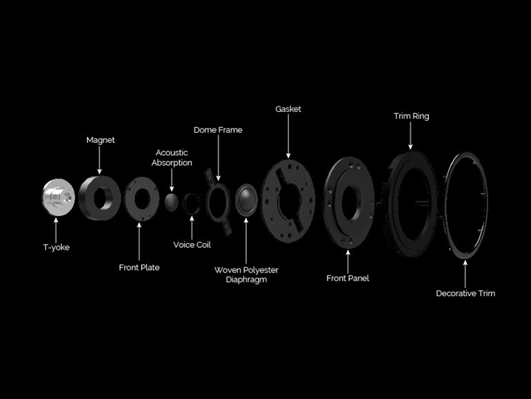 High frequencies are produced by a 25mm woven polyester dome with a high-loss damping coating, resulting in extended, smooth treble response. The front plate is designed acoustically with a flat profile and minimal waveguide to enhance dispersion and output.